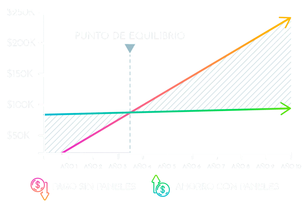 En la mayoría de los casos, nuestros clientes logran hasta 98% de ahorro total; en escenarios ideales, el cargo de energía puede llegar a 0 (100% de ahorro en energía), quedando solo cargos fijos e impuestos. El retorno típico está entre 2 y 4 años, según consumo y tamaño del sistema.